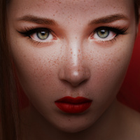 The image shows a close-up of a person with fair skin and striking blue eyes. They have red lips and are looking directly at the camera with a neutral expression. The background is plain, which puts emphasis on the person's face.