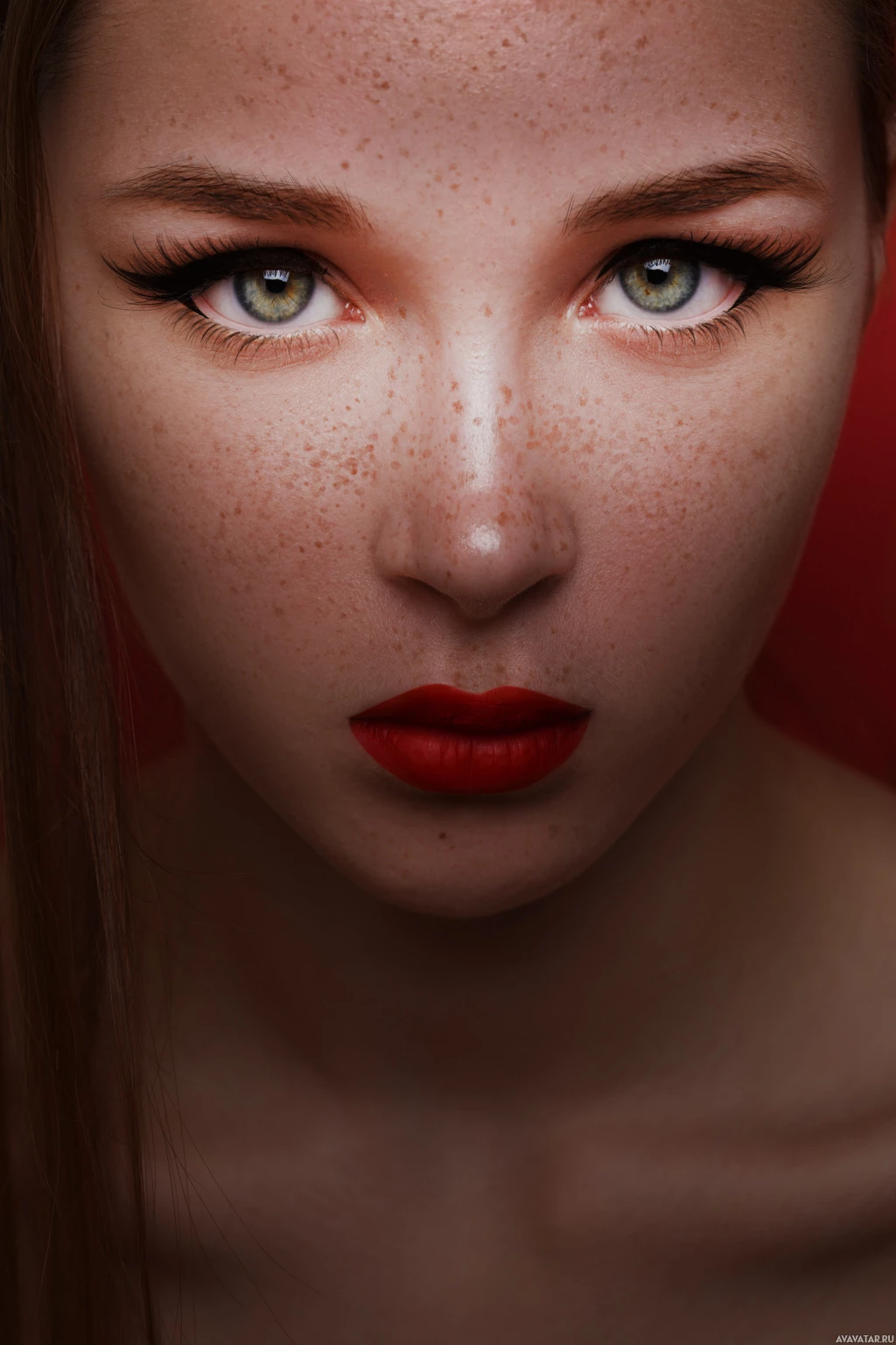 На картинке крупным планом изображен человек со светлой кожей и поразительными голубыми глазами. У него красные губы, и он смотрит прямо в камеру с нейтральным выражением лица. Фон простой, что делает акцент на лице человека.