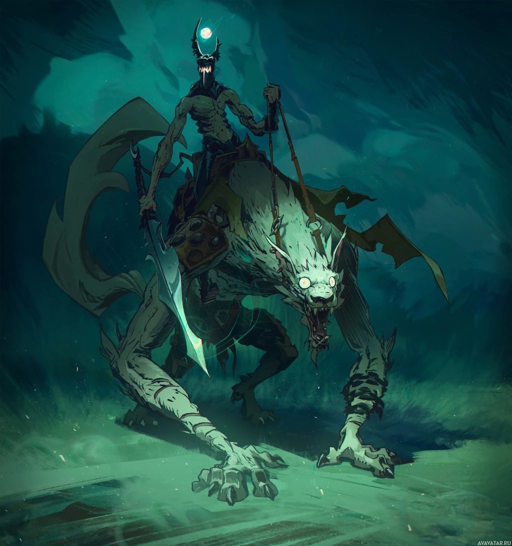 a fantasy scene where a character is riding a werewolf. The werewolf has an aggressive posture, with its mouth open and