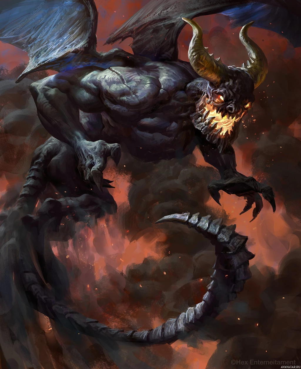 a fantastical creature that resembles a demon. It has large, menacing eyes,