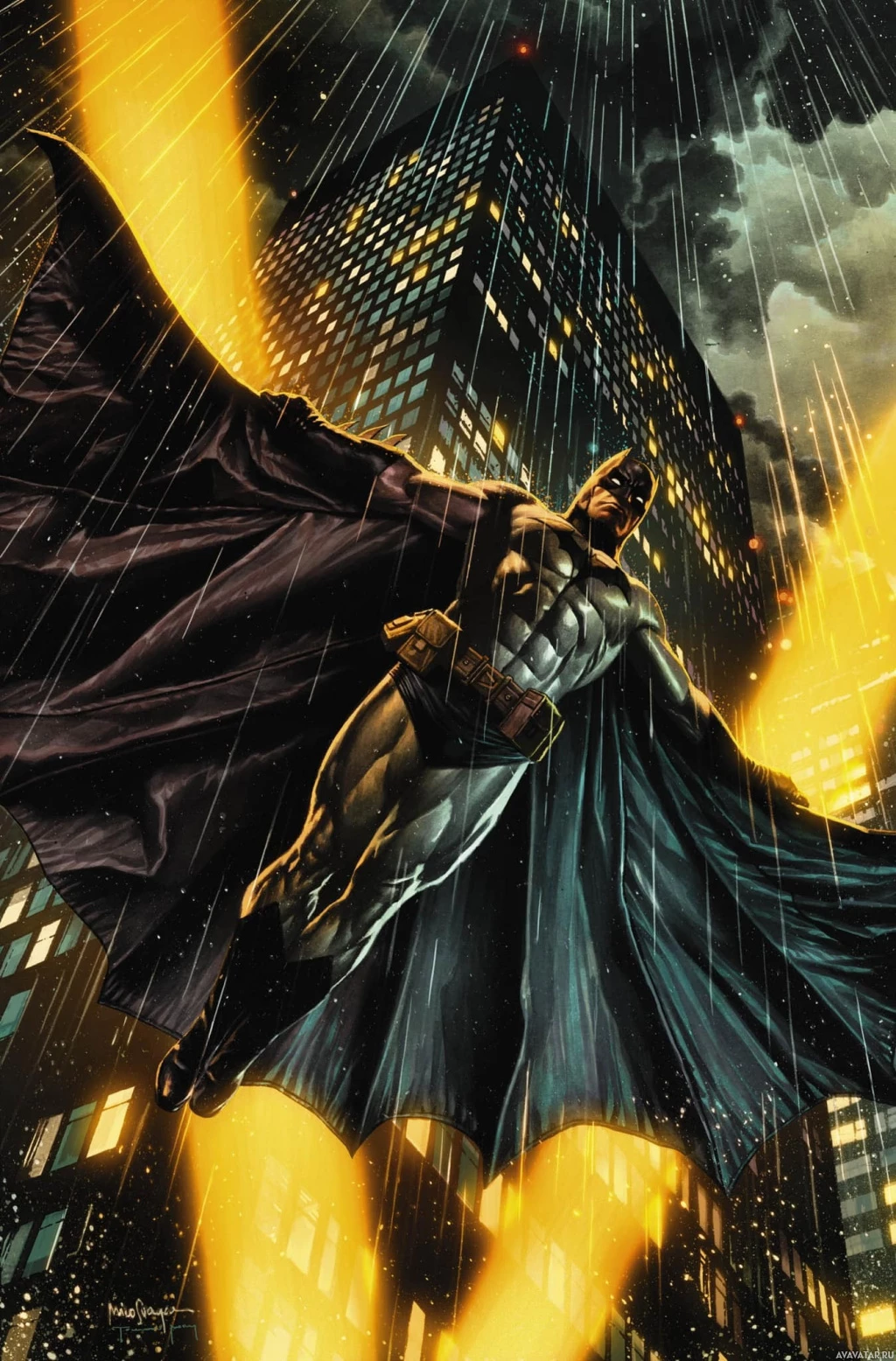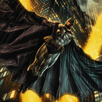 night scene, possibly within Gotham City. There are elements such as rain and lightning, suggesting that he might be facing an adversary or encountering some sort of environmental challenge while trying to complete his mission.