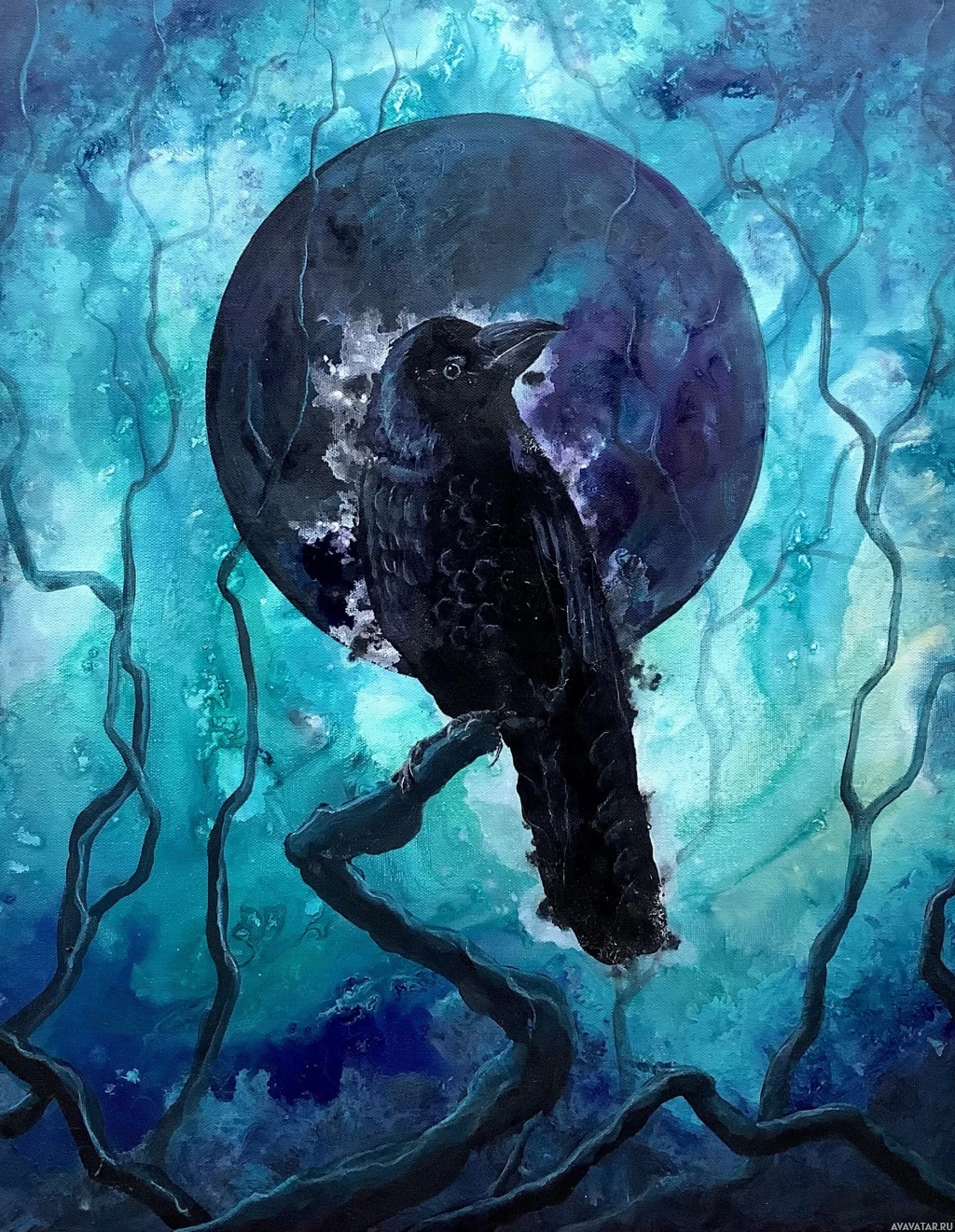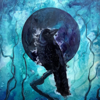 a full moon, which adds a mystical or nocturnal atmosphere to the scene. The color palette is predominantly dark and cool tones with