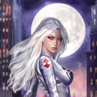 white hair, dressed in a form-fitting superhero costume. She is set against