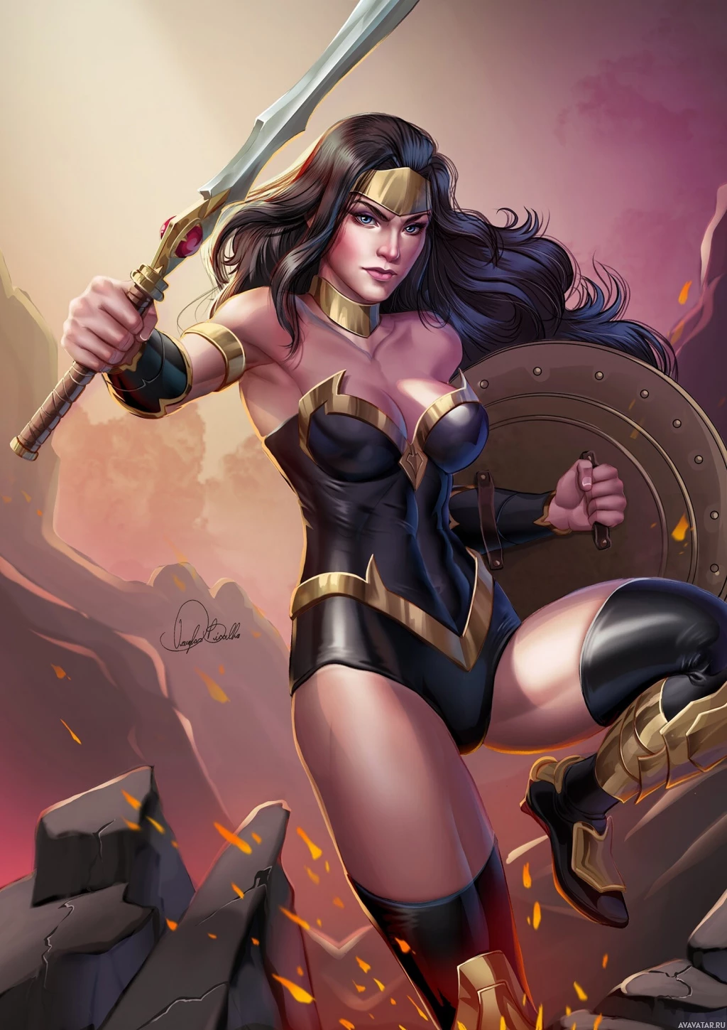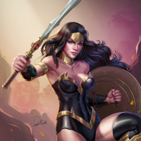 superhero costume, which includes a black bodysuit with a gold emblem on her chest, red and gold armor, bracelets, and a tiara. In her hands, she holds her signature weapons: