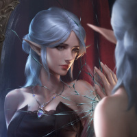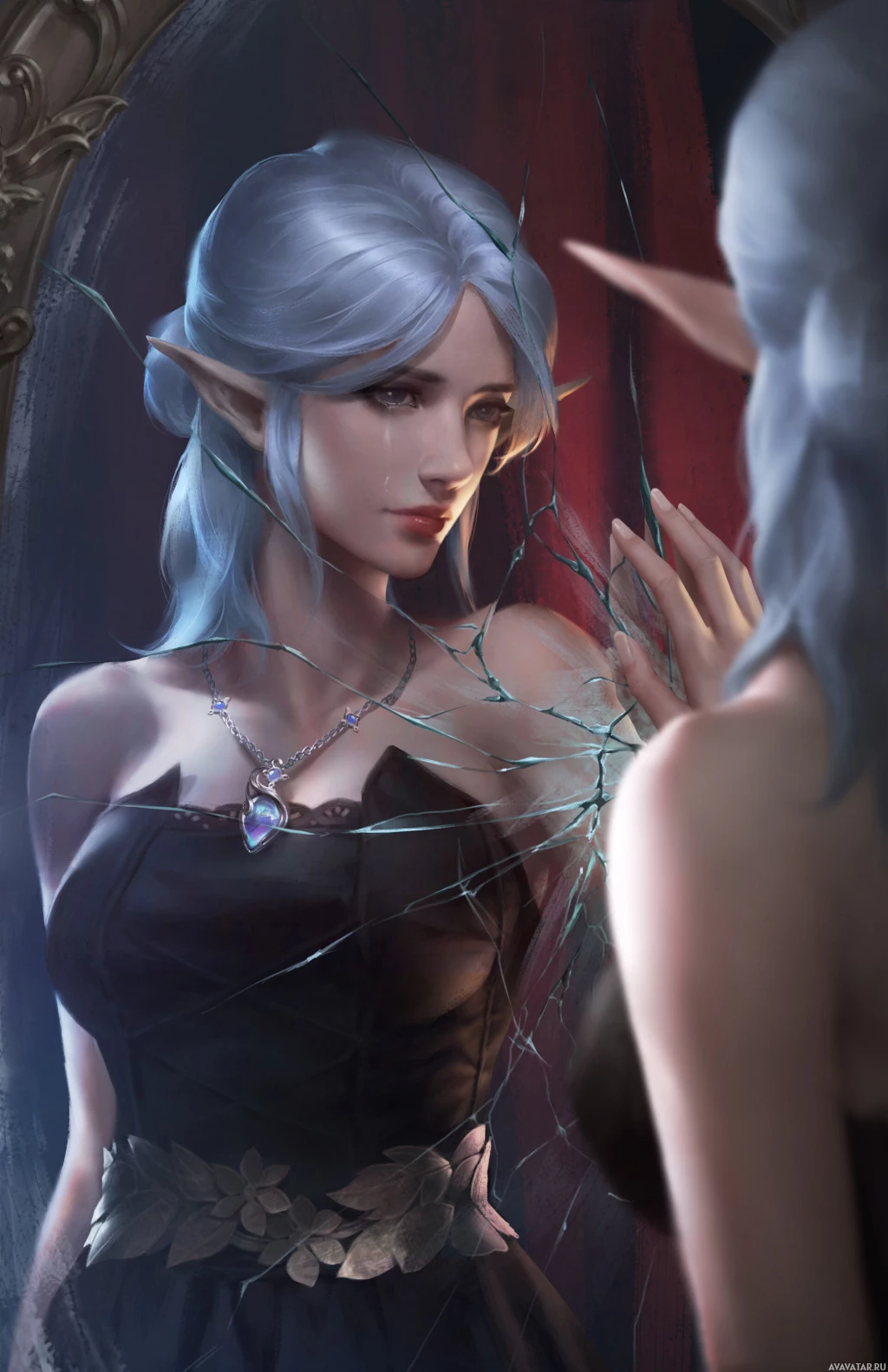 a dark outfit, suggesting they might be an elf as well. The overall atmosphere of the image could suggest themes of fantasy, self-reflection, or even a narrative about perception or appearances.