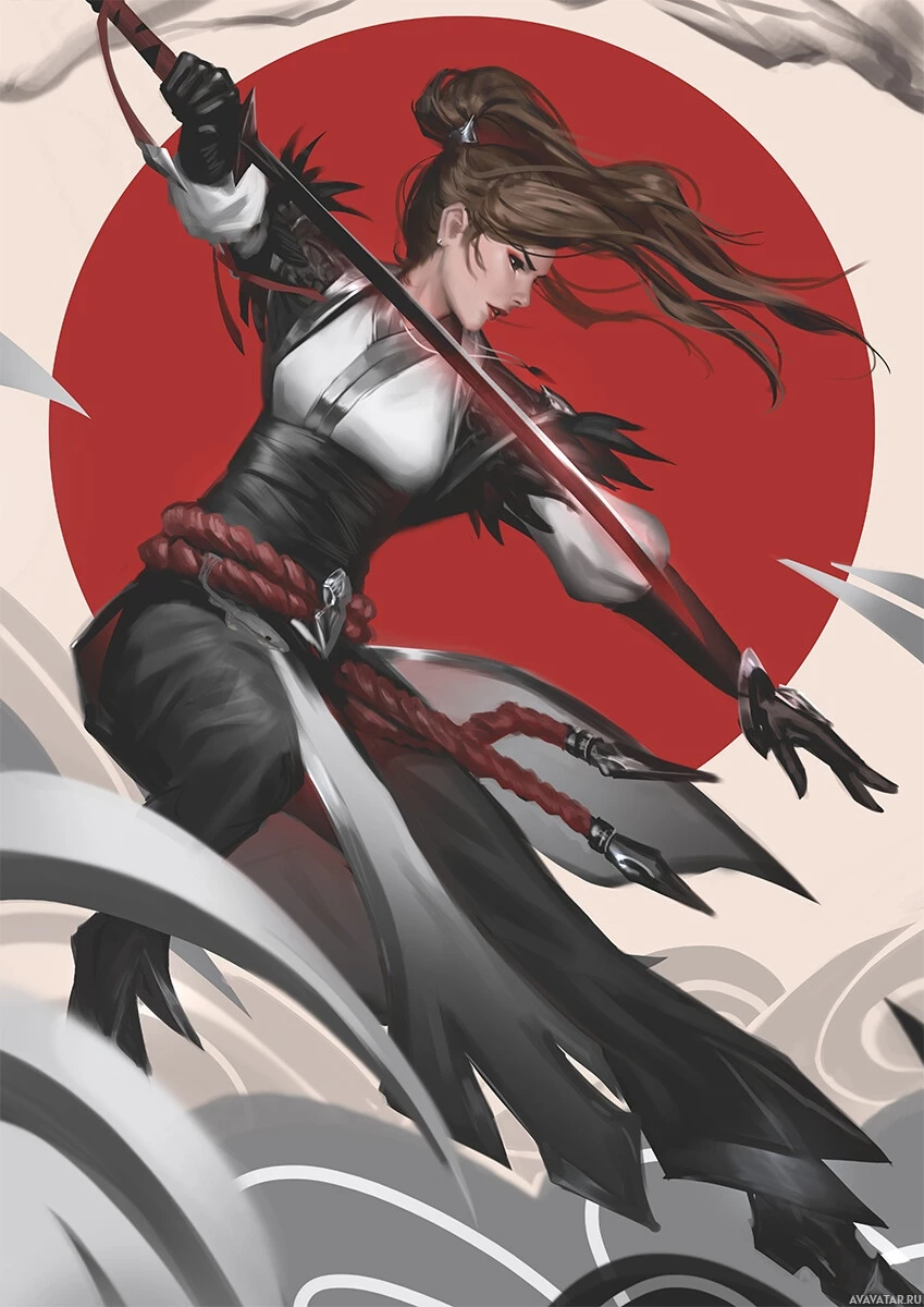 a female character dressed in what appears to be a martial arts or fantasy-inspired outfit, wielding a sword and preparing for combat. She is set against a backdrop of red and white, which may suggest a scene of