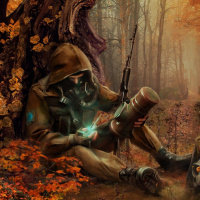a hooded figure sitting on the ground in what appears to be a dense forest. There are various elements that suggest this could be a scene from "Stalker," such as the overall atmosphere, the presence of a pipe in the foreground which is characteristic of the setting, and possibly the clothing style of