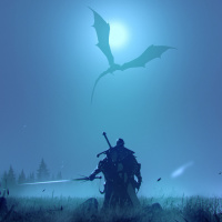 На картинке изображена фантастическая сцена с силуэтом дракона, летящего по ночному небу. Под драконом виден силуэт воина, стоящего на земле и держащего что-то похожее на меч или посох. Общая атмосфера напоминает сцену из игры или истории, в которой присутствуют элементы фэнтези и приключений.