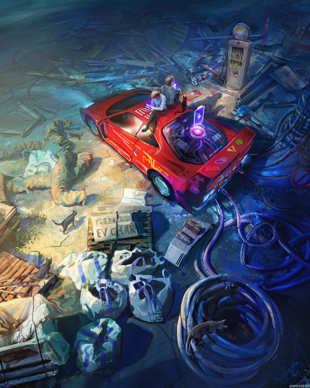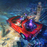 a futuristic scene with a red sports car prominently featured. There are two individuals sitting in the driver's seat; one appears to be a woman and the other is not clearly distinguishable. The environment around the car suggests a setting post-apocalypse or in