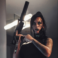 science fiction themes, complete with a helmet and a mask that conceals her identity. She has tattoos on her arms and is wearing high-