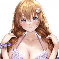 floral patterns and has accessories like barrettes in her hair and what appear to be small flowers on the bikini. The character seems to have