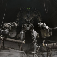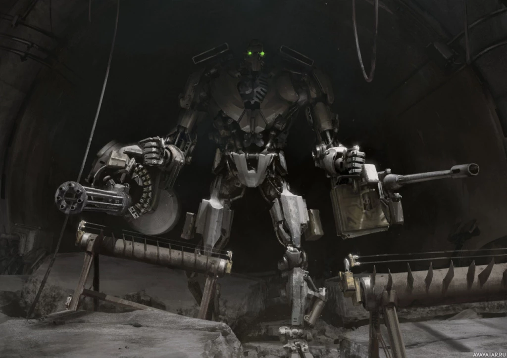 a robotic figure standing in what appears to be a military or industrial setting. The robot is holding