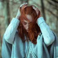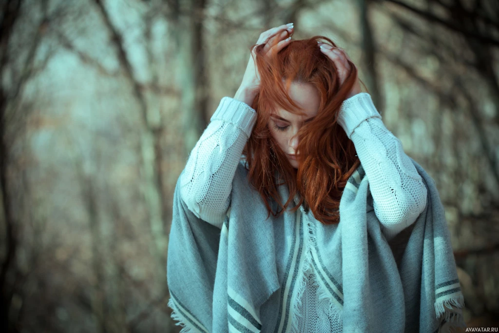 red hair, wearing what appears to be a knitted sweater. She has her eyes closed and is resting her head in her hands, as if she's contemplating or feeling introspective. Her gaze is directed downwards, which suggests a moment of