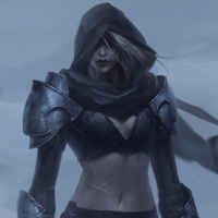 blonde hair that covers part of her face, and her expression seems determined or focused. The background suggests a cold or misty environment, possibly indicating a battlefield or