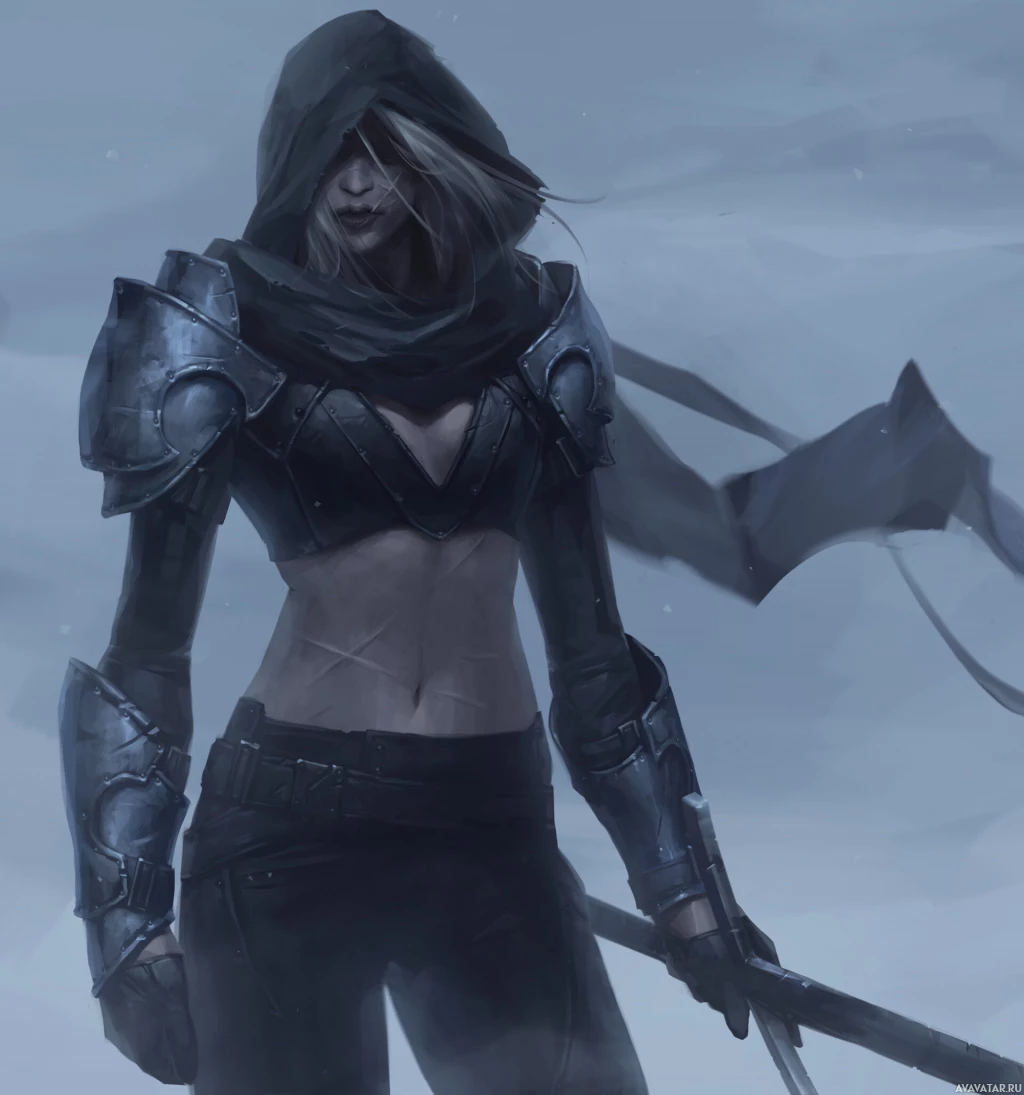 black armor with shoulder guards and has a sword sheath strapped across her chest. Her attire also includes a dark cape, and she is holding
