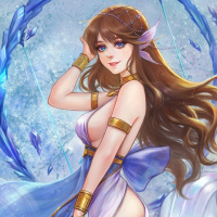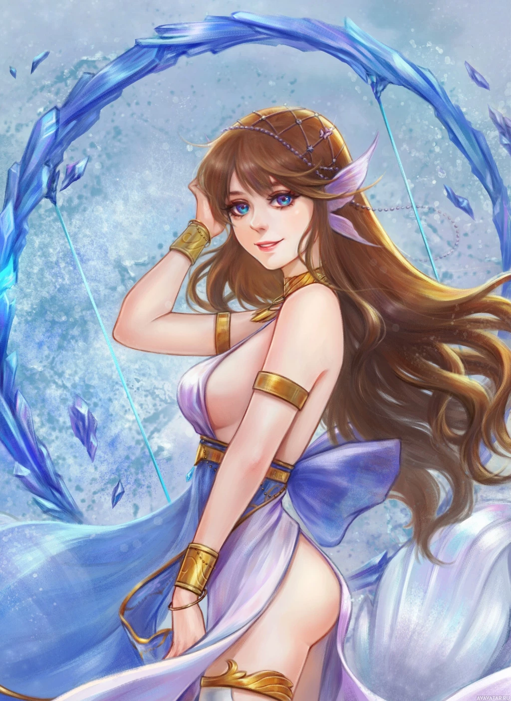 female character who appears to be a mythical or fantasy-themed figure. She has long brown hair,