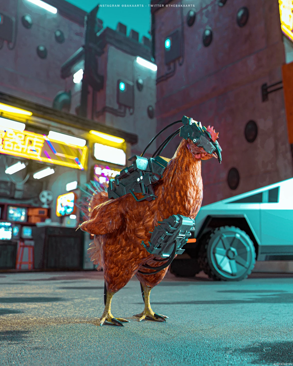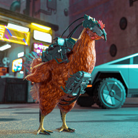 an unexpected twist: there's a robotic chicken standing on the street. This is an artistic depiction and not something that exists in reality. It has been given futuristic elements such as advanced technology, possibly a headset or communicator, attached to the chicken, suggesting a blend of real-life with