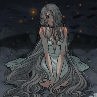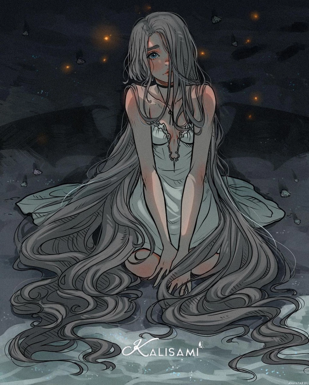flowing hair and a somewhat contemplative or dreamy expression. She is kneeling on what appears to be a beach at night, with