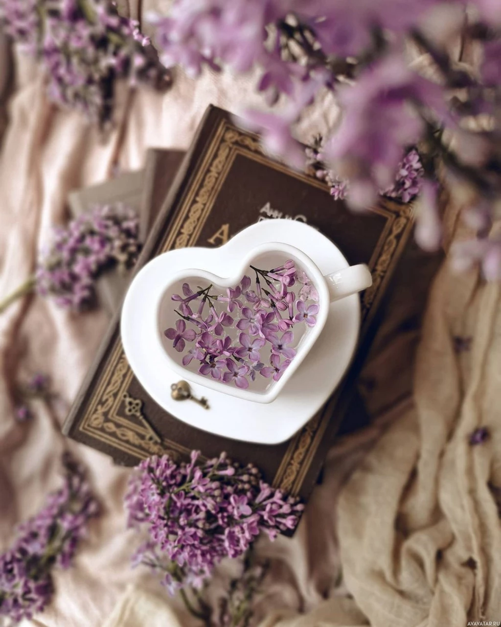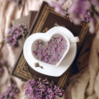 purple flowers, likely lavender, which match the color of the heart-shaped mug's contents. The setting creates a cozy and romantic atmosphere, often associated with coffee and books in a comfortable