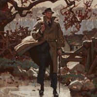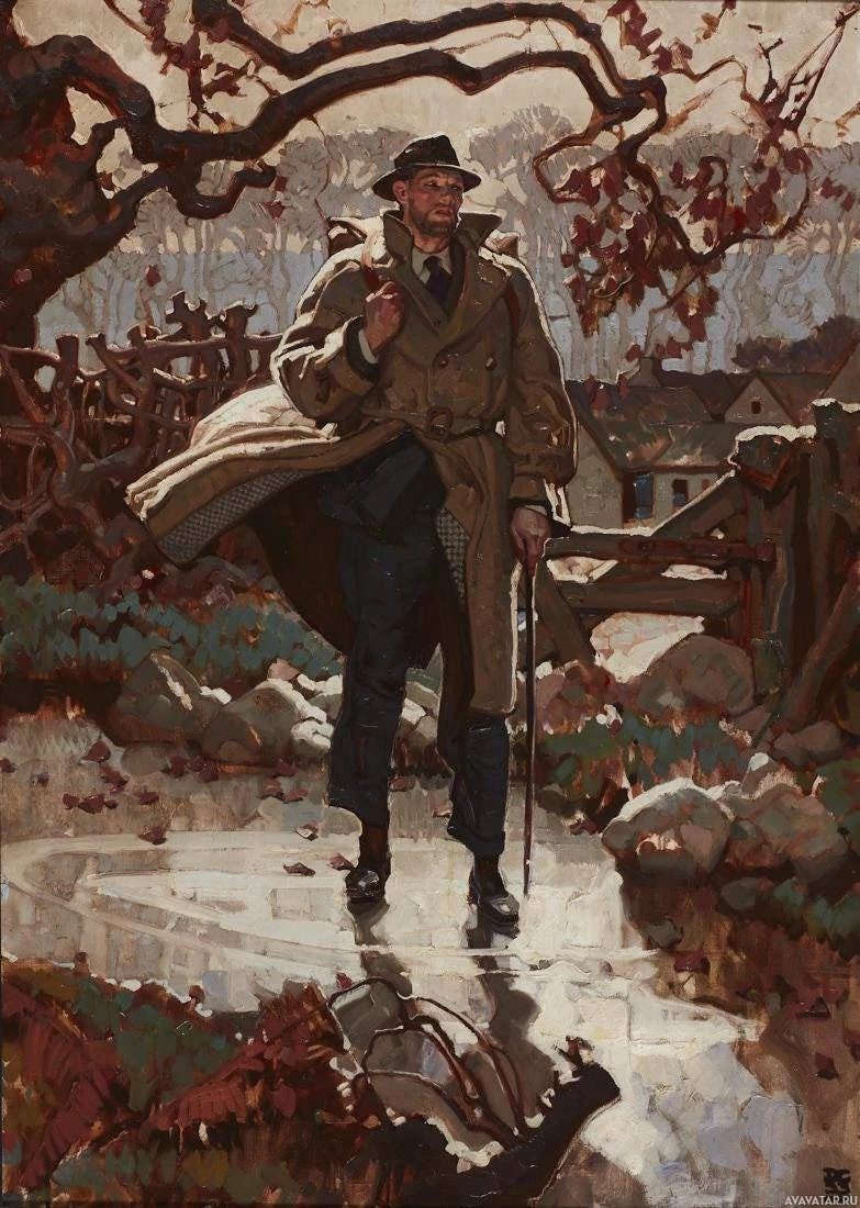 a trench coat, walking through what appears to be a rural or woodland setting during a time of year when the leaves are changing colors, suggesting either autumn or winter. The man is wearing a hat and has a cane, which adds to his character's detective-like appearance, reminiscent of classic