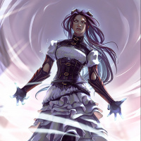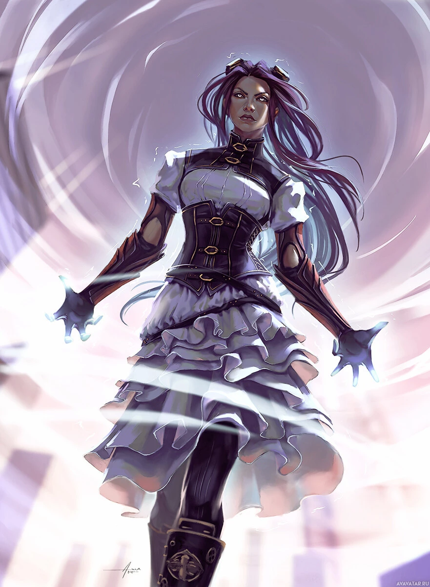 purple hair, wearing a corset-style dress and boots, holding a weapon that resembles a crossbow. Her expression is serious, and she seems to be in motion, possibly in