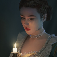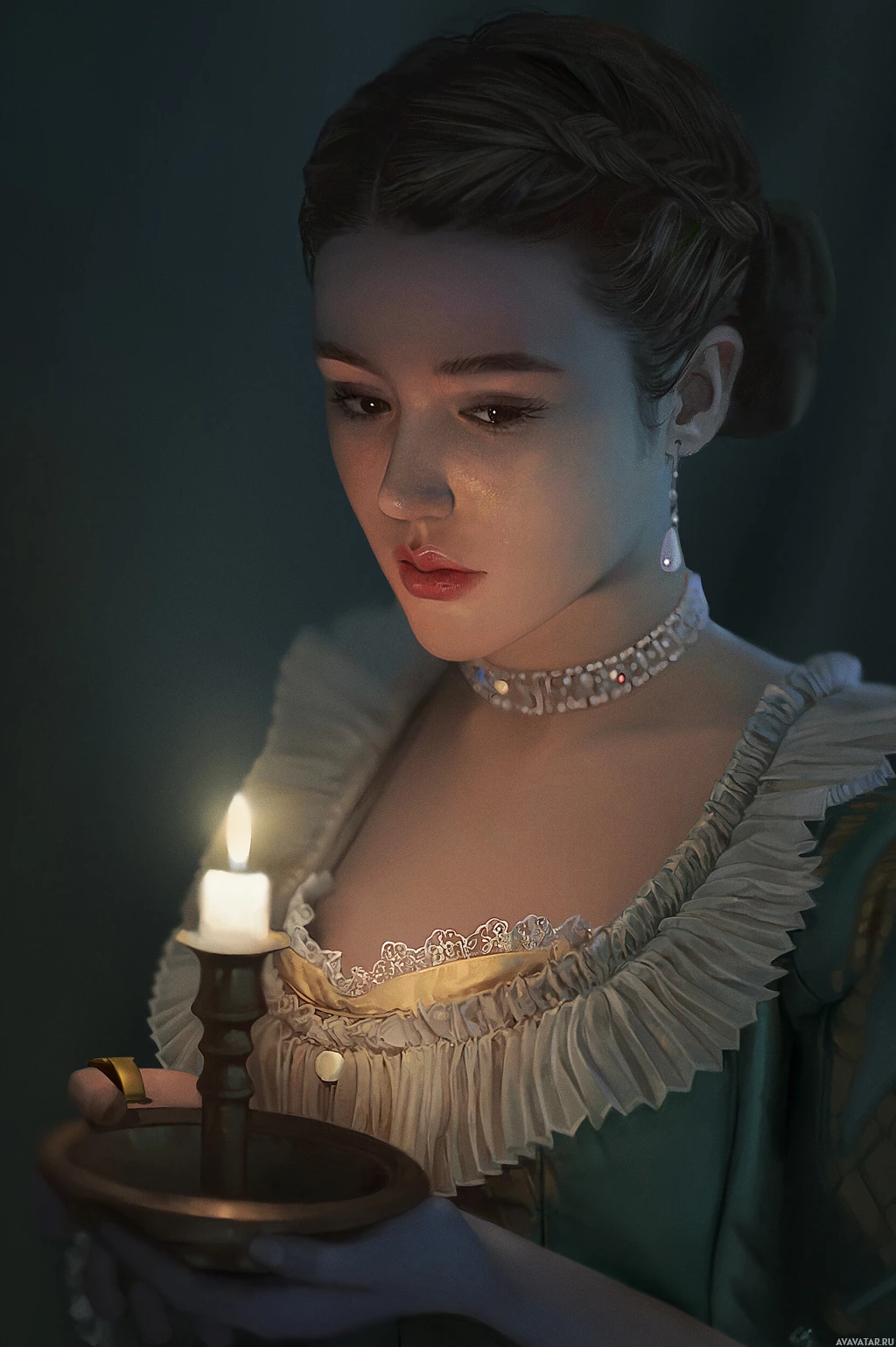 a young woman dressed in historical clothing, possibly from the 17th century, based on her attire and hairstyle. She is holding a candle with both hands, looking intently at it as if she is focused or contemplating something. Her expression suggests she might be deep in thought or feeling introspective. The image has