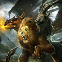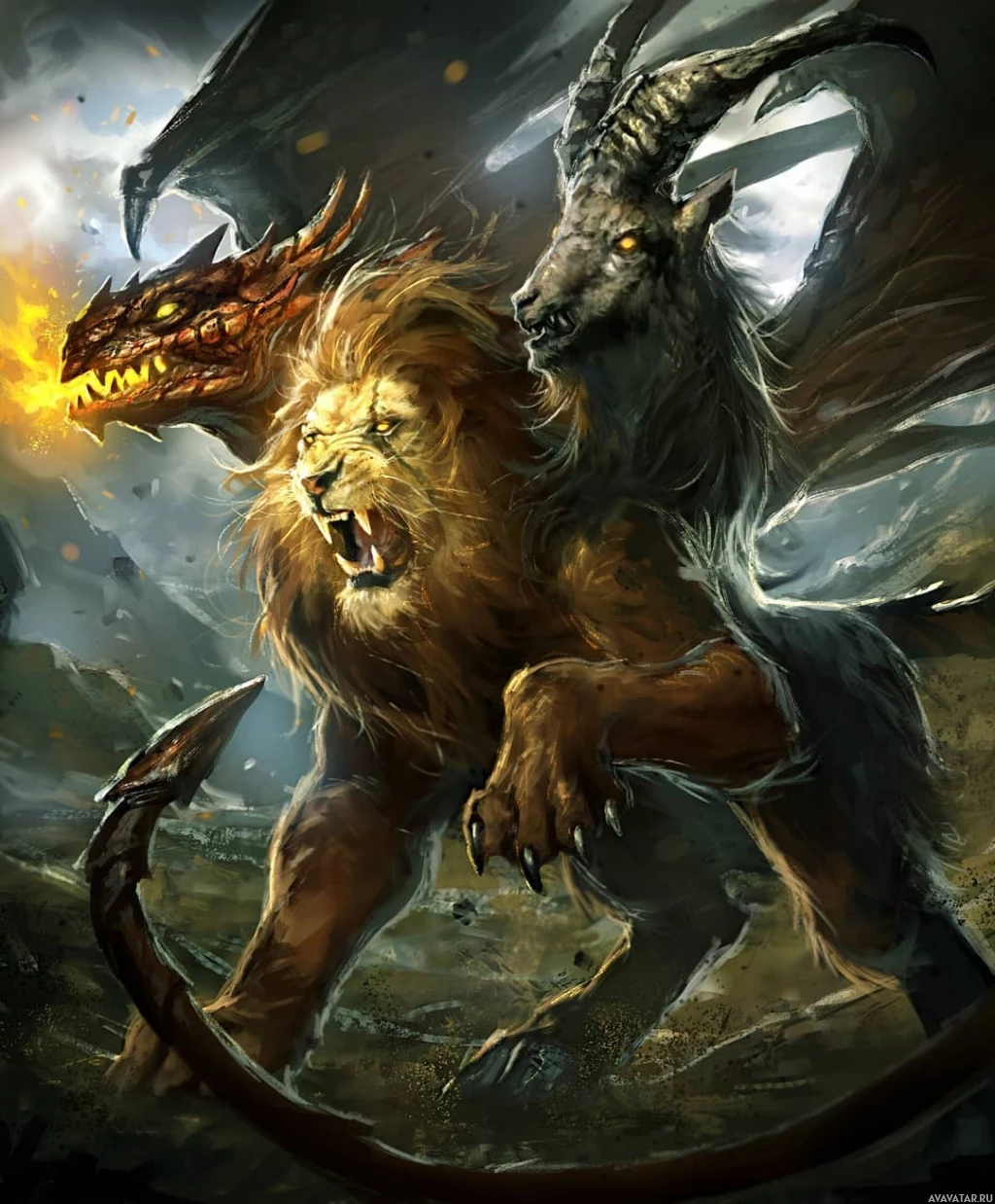 mythical creatures, one resembling a lion and the other a goat or billy-goat with horns, are engaged in combat. They are positioned in the center of the frame, with the lion on the left side and the goat-like creature on the right side. The background is dramatic, featuring