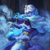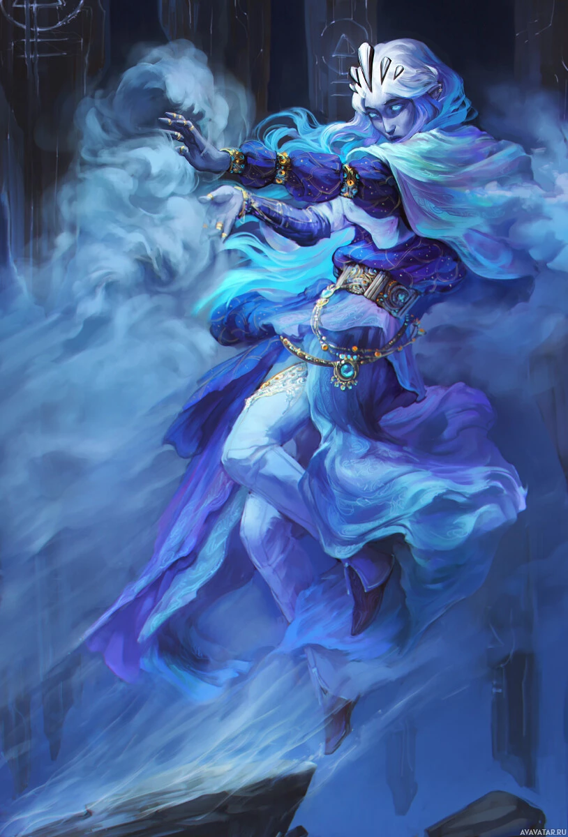 magical act or dance. The character is surrounded by smoke, which adds to the ethereal and mystical atmosphere of the scene. The artwork has