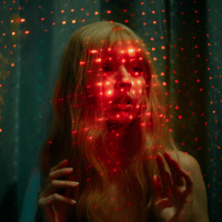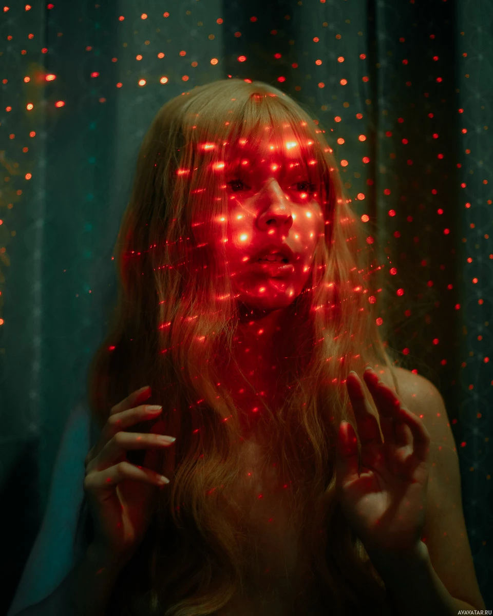 a state of surprise or wonder. Surrounding her head are numerous red sparks or particles that are evenly distributed across the frame, giving