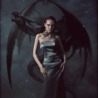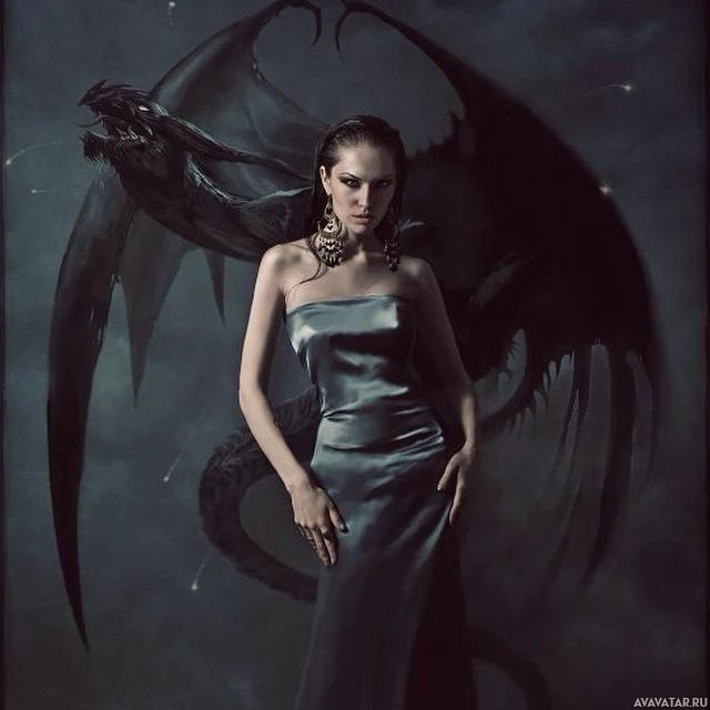 elegant dress. She stands confidently with her hand placed on her hip, and she gazes directly at the viewer. Behind her, there is an artistic depiction of a dragon or a similar