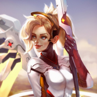 the video game Overwatch. She is shown in her hero form, which includes a white and red suit with a visor that displays a blue cross symbol, representing her