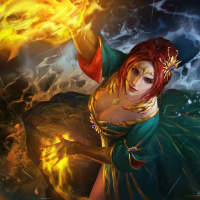 a dynamic pose, with her arm outstretched towards an orb of energy or magical element that she seems to be controlling or manipulating. The background suggests a scene of power and magic, likely within