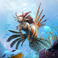 The image depicts a fantasy illustration of a mermaid. She has an aquatic body with scales and fish-like features, such as fins on her arms and a tail. Her upper body is humanoid, complete with a face that includes eyes, eyebrows, and hair resembling a typical human hairstyle. The background shows underwater elements like coral, fish, and other