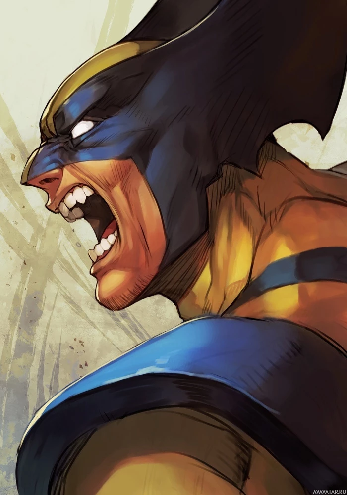 На картинке изображен персонаж, известный как Росомаха из комиксов "Люди Икс". Он изображен с открытым в реве или крике ртом, а его мускулы четко очерчены, демонстрируя его силу.