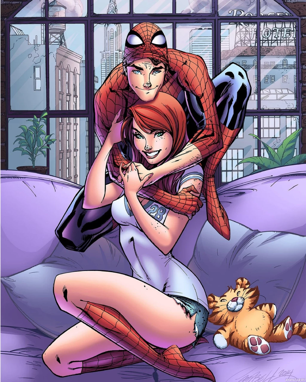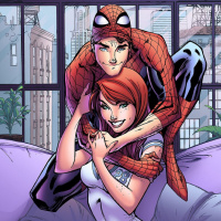 Peter Parker, known as Spider-Man, and his girlfriend, Mary Jane Watson. They are depicted in a domestic setting, with Peter comforting