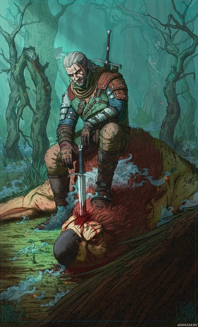 an intense moment, sitting on the back of a fallen creature, possibly a werewolf, with one hand holding a sword and the other hand resting on his knee. The setting appears to be