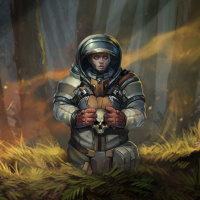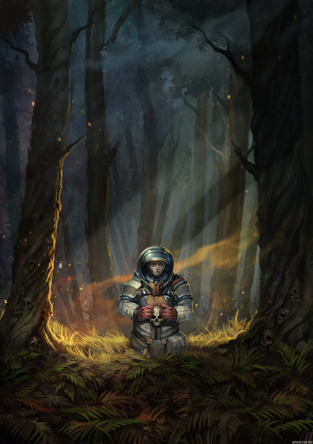 The image depicts an astronaut sitting on a grassy area within a forest. There is no skull visible in this picture, nor any specific indication of the astronaut being within a cave or surrounded by a group of people. It appears to be a fantasy or science fiction-themed illustration rather than a real-life scene.