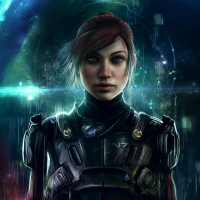 a female character in a sci-fi setting, which is reminiscent of the "Mass Effect" video game series. She appears to be a soldier or operative, equipped with