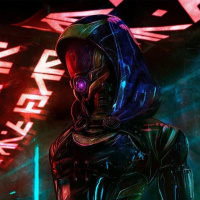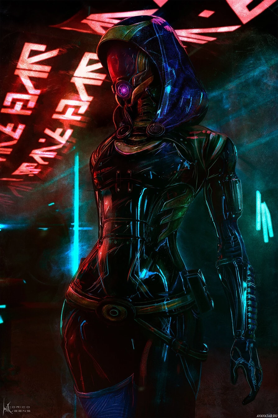 На картинке изображен персонаж из серии видеоигр "Mass Effect". Этот конкретный персонаж известен как Тали и изображен здесь в своем культовом костюме с кибернетическими усовершенствованиями. Дизайн очень детализирован, демонстрируя сочетание органических и механических элементов, типичных для дизайна персонажей Тали в игре.
