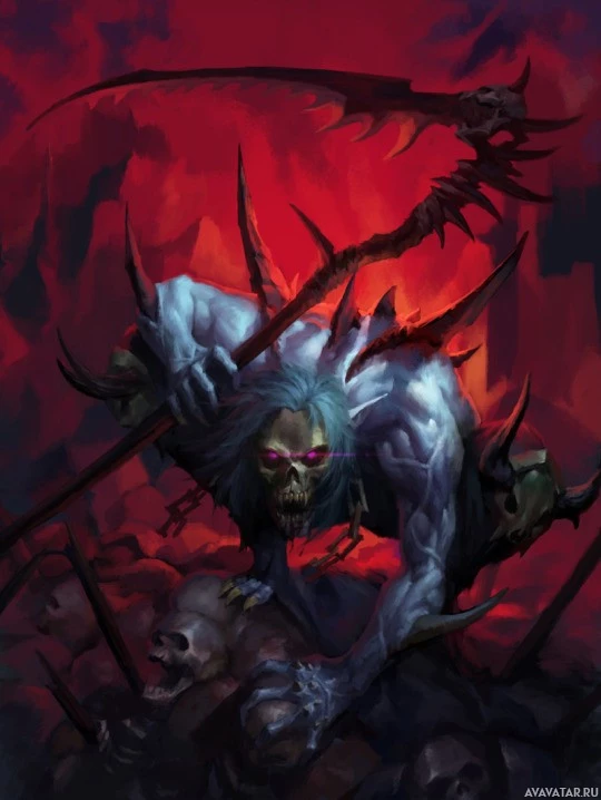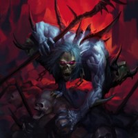 glowing eyes, and an intense expression. They are holding what appears to be a skull in one hand, suggesting themes of death or the macabre. The background has fiery red tones, which add to the dark and