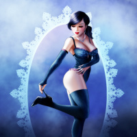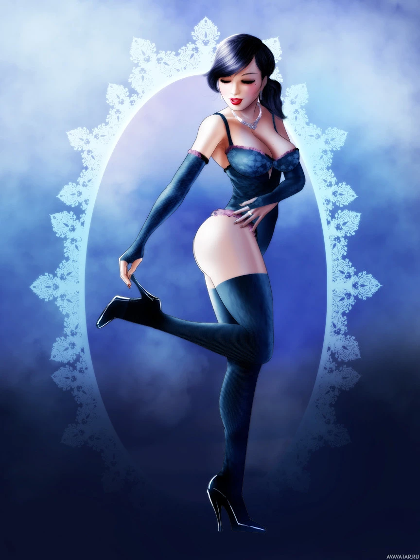 an elegant outfit that could be associated with a vintage or fantasy theme, given the style of clothing and accessories such as stockings and garters. The background suggests