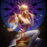 blonde hair and is wearing elaborate, ornate clothing with gold and purple accents. Her wings are spread out behind her, adding to