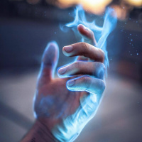 The image shows a hand reaching towards another hand, but instead of physical contact, there is a glowing blue energy or light connecting the two hands. This creates an effect where the two hands appear to be floating or hovering apart from each other with this ethereal connection.