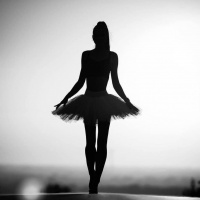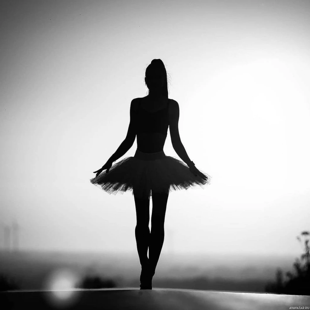 a silhouette of a woman poised in a ballet pose. She appears to be standing on one leg, with the other leg lifted behind her and her arms gracefully extended. Her posture is elegant and suggests