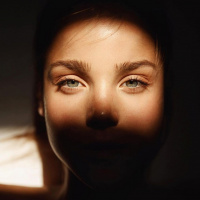 The image shows a person with a soft, focused expression looking directly at the camera. Sunlight is streaming down one side of their face, creating a silhouette effect on the other side. The individual has light skin and appears to have long hair. They have striking blue eyes that stand out in the photo.