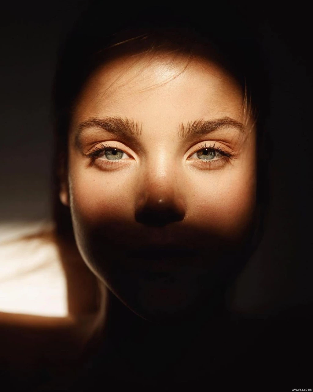 На картинке изображен человек с мягким, сосредоточенным выражением лица, который смотрит прямо в камеру. Солнечный свет струится по одной стороне его лица, создавая эффект силуэта на другой стороне. У человека светлая кожа и длинные волосы. У них поразительные голубые глаза, которые выделяются на фотографии.