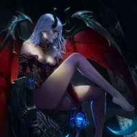 white hair and what appears to be the upper body of a succubus. The succubus is depicted in a seductive pose, wearing a black corset with