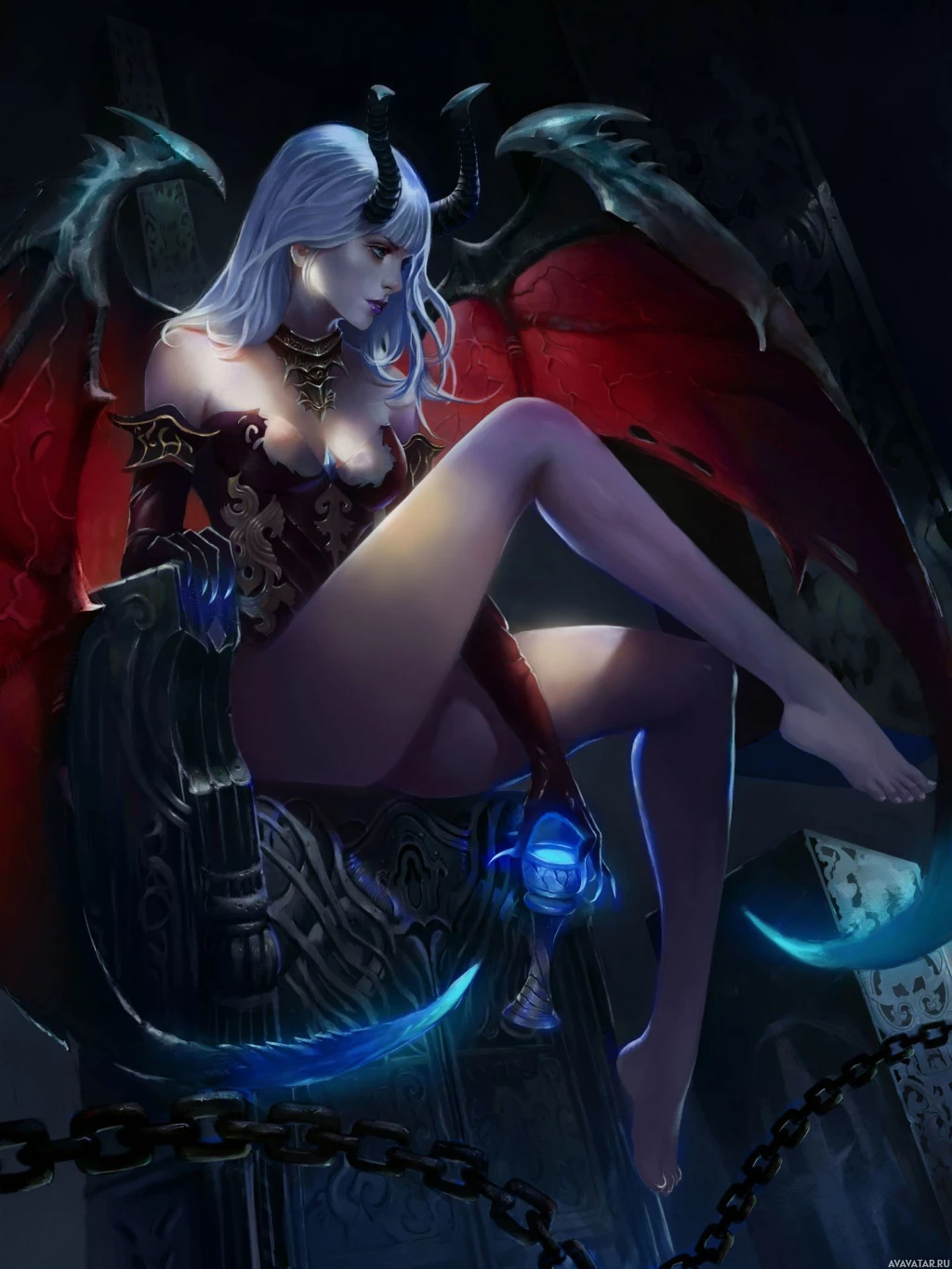 gold accents, and has large red wings attached to her back. She is holding a staff or wand, which might suggest she possesses some form of