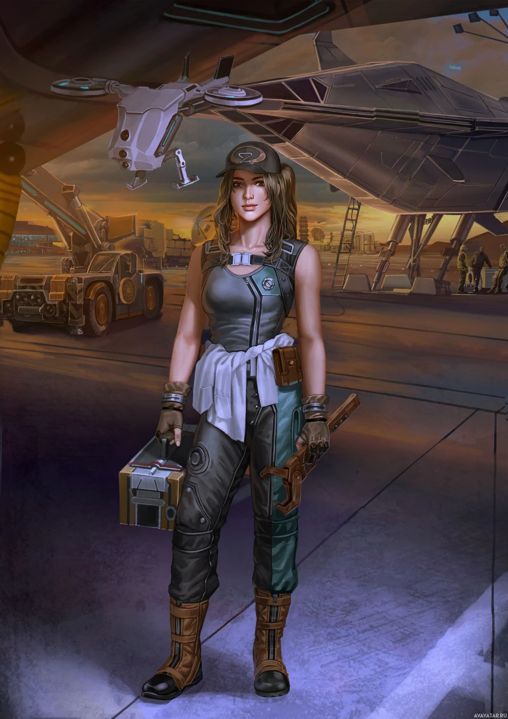 various vehicles and equipment around her, including what looks like jet packs or propulsion units. Her attire consists of a jumpsuit with