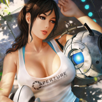the video game "Portal." She is depicted with a stylized, exaggerated appearance typical of anime or manga art styles. The character is wearing a white and blue outfit that resembles the one worn by Chell in "Portal," which includes